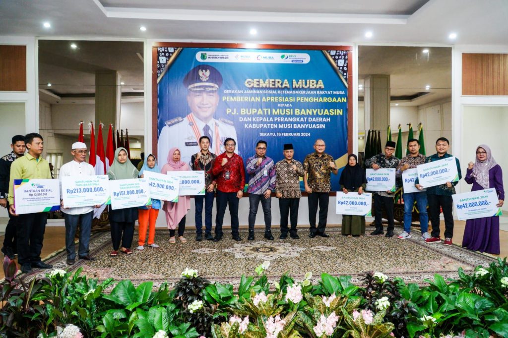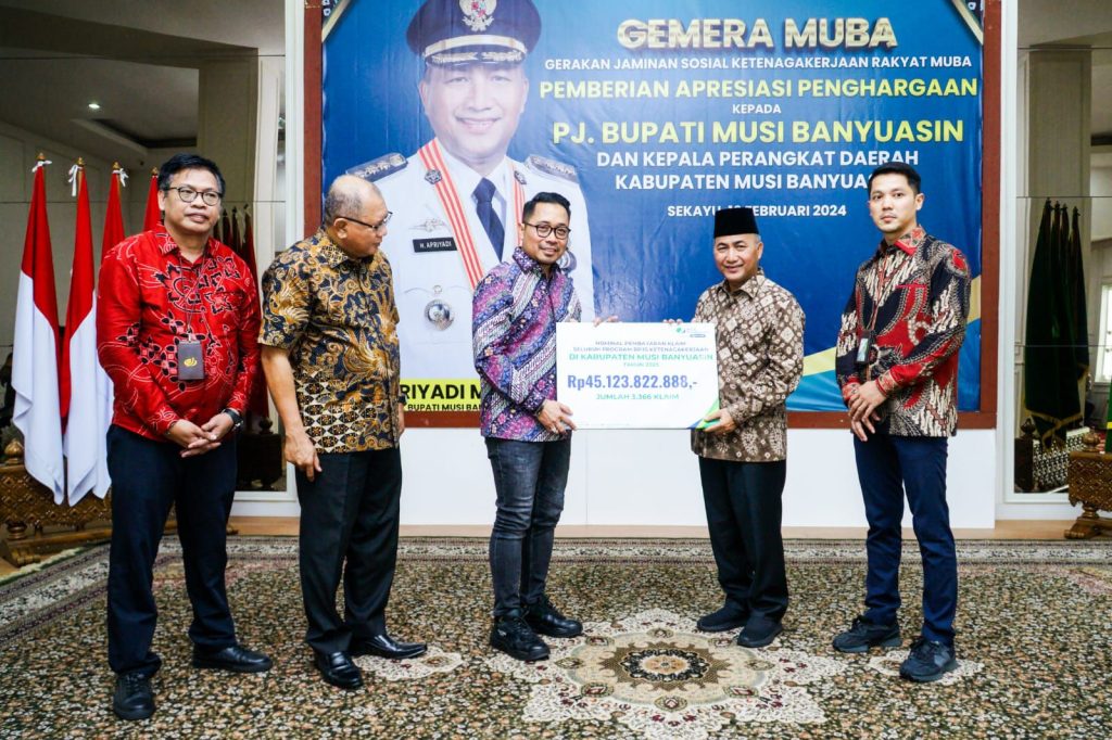 Penghargaan itu diserahkan langsung oleh Kepala Kantor BPJS Ketenagakerjaan Wilayah Sumatera Bagian Selatan Muhyidin, dalam acara bertajuk Gemera Muba (Gerakan Jaminan Sosial Ketenagakerjaan Rakyat Muba), di Guest House Griya Bumi Serasan Sekate (Rumah Dinas Bupati Muba), Jumat (16/2/2024).