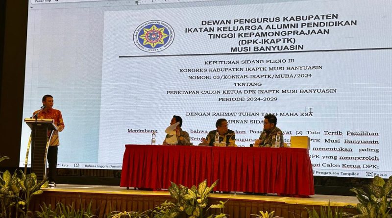“Akhmad Toyibir ditetapkan sebagai Ketua DPK terpilih IKAPTK Musi Banyuasin periode 2024 – 2029 secara aklamasi mendapat suar 50%+1 orang anggota IKAPTK sesuai AD ART dan tata tertib kongres,” tambahnya.